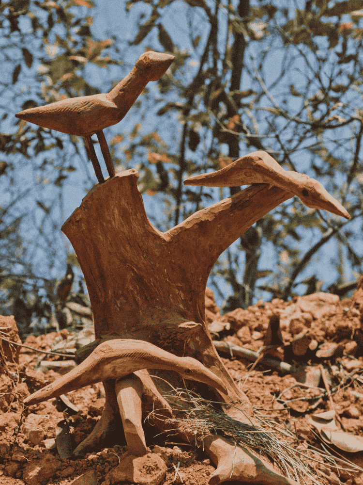 O artesão apresenta suas esculturas de madeira inspiradas na mata que guarda e cuida. Cada peça nasce de madeira caída, respeitando a natureza, e transforma galhos, raízes e tocos em passarinhos e seres encantados, preservando as cores naturais da madeira. A arte do Mestre é extensão de seu cuidado com a floresta, da fé nas tradições e do encantamento que habita seu cotidiano.