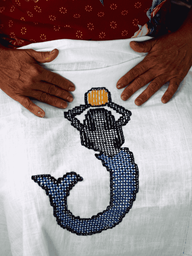 A artista borda cenas à mão livre: paisagens, bares antigos, cadeiras cercadas de flores — tudo sobre tecidos reaproveitados, que ela mesma garimpa, desmonta, tinge e prepara. Cada peça é única, desenhada direto no linho e preenchida com linhas coloridas, ponto por ponto. Além dos bordados, ela também cria monstrinhos: bonecos feitos com retalhos, flores artificiais, bijuterias esquecidas. São criaturas afetuosas, divertidas, que encantam pelo improviso e pela expressão.